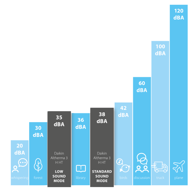 Standarta režīmā āra bloka trokšņu līmenis ( 3m attālumā) sastāda 38dB. Tas ir trokšņu līmenis kas pielīdzināms kaut kam starp putnu skaņām un atrašanos bibliotēkā. Klusuma režīmā trokšņu līmenis 3m attālumā sastāda vien 35 dB.